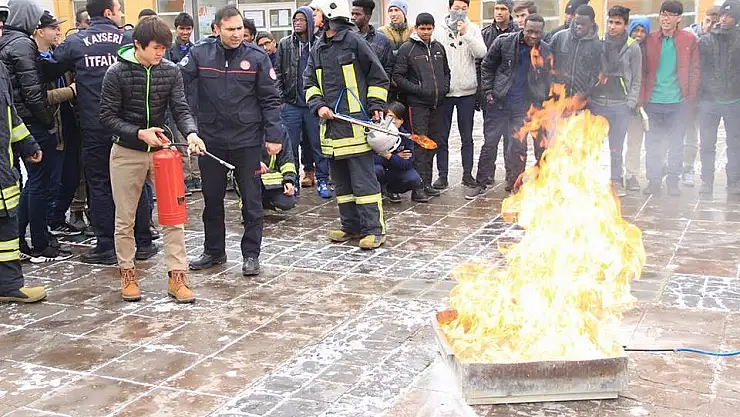 Kayseri'deki Uluslararası Şehit Ömer Halisdemir Anadolu İmam Hatip Lisesi öğrencileri, Kayseri Büyükşehir Belediyesi İtfaiye Daire Başkanlığı tarafından verilen yangın güvenliği eğitiminde, yangına nasıl müdahale edileceğini öğrendi.
