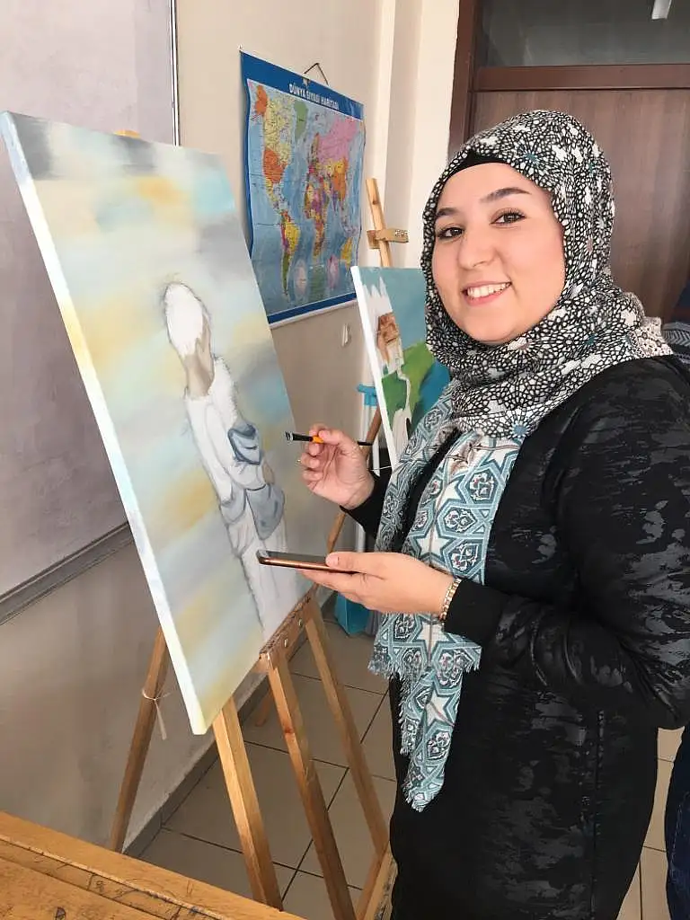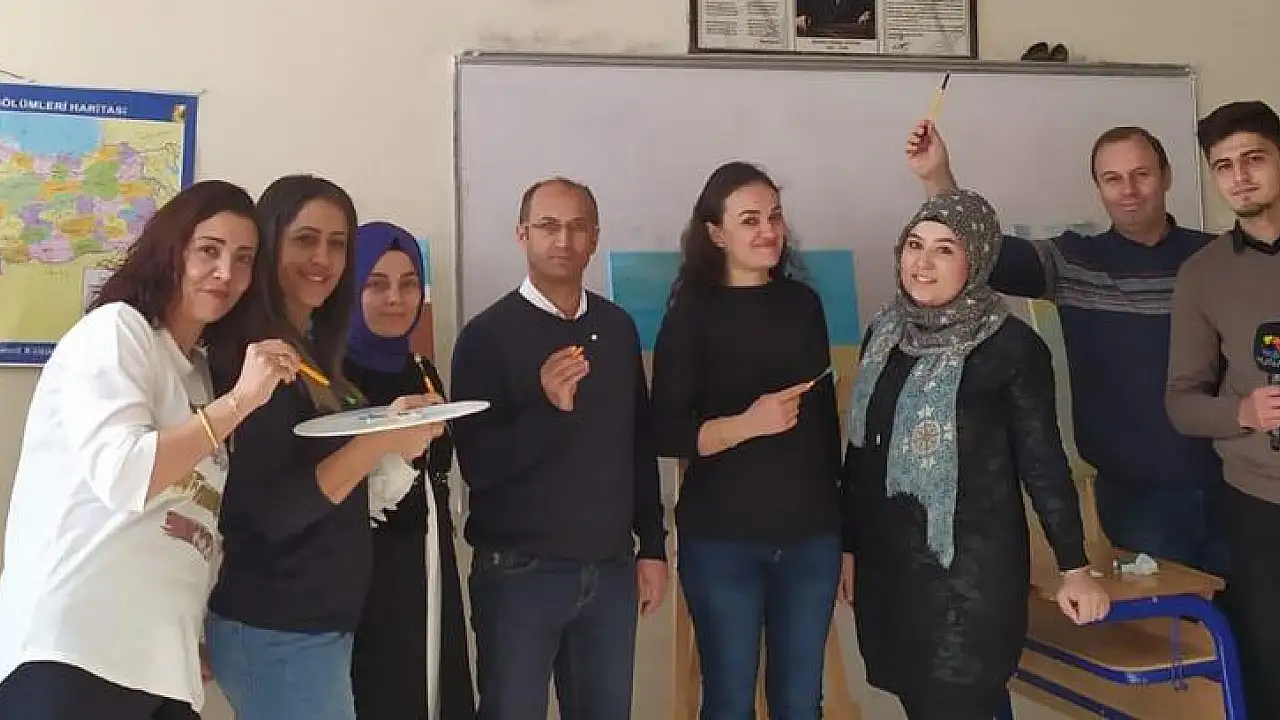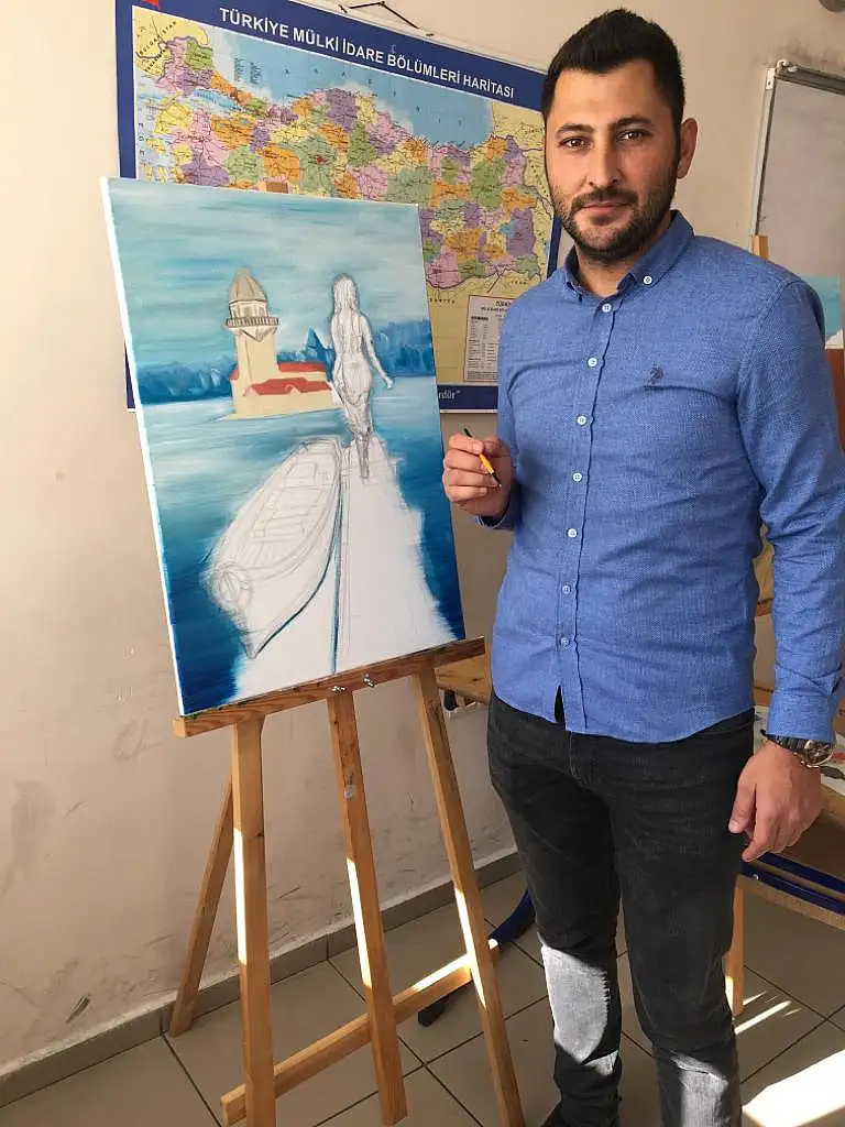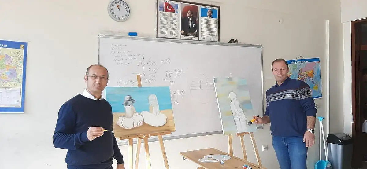 Yalçın: “Bizim işimiz çocuklarla, ergenlerle sabahtan akşama kadar bir dünya çocukla ilgileniyoruz uğraşıyoruz bu doğal olarak bizde bir takım stres gibi sebeplere yol açabiliyor. Biz de hem rahatlamak hem de boş vakitlerimizi değerlendirmek için böyle bir proje ortaya koyduk. Sağ olsunlar bütün arkadaşlarımız da katıldılar. Öğrenciye değil tuvale fırça attık konulu bir proje başlattık. Boş derslerimizde teneffüslerde seminer zamanlarımızda resim yaparak hem stres atıyoruz hem daha önce hiç resim yapmamış arkadaşlarımız bir şey öğrenmiş oluyorlar. Bizim için de keyifli bir çalışma ortamı olmuş oluyor” dedi.
