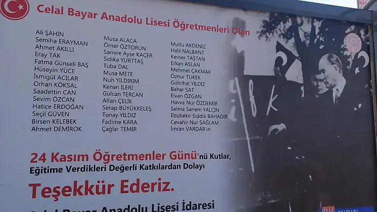 Kayseri Celal Bayar Anadolu Lisesi Okul İdaresi, 24 Kasım Öğretmenler Günü'nde okuldaki öğretmenlerine anlamlı bir hediye hazırladı.Okul Müdürü Mehmet Metin'in öncülüğünde hazırlanan hediyede okulda görev yapan öğretmenlerin isimlerinin yazılı olduğu afiş