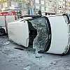 Kayseri'de bir otomobil ile çarpışan araç yan attı.Maddi hasarlı kazada, olay yerinde vatandaşların araçtan akan yakıta aldırış etmeden sigara içmeleri dikkat çekti.