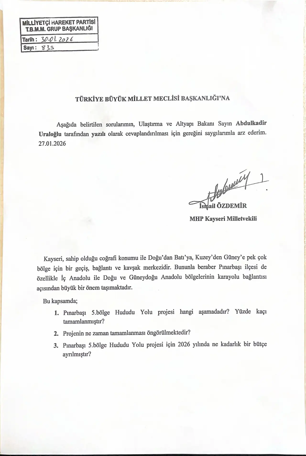 Milliyetçi Hareket Partisi Kayseri Milletvekili İsmail Özdemir, Ulaştırma ve Altyapı Bakanı Abdulkadir Uraloğlu’na yanıtlaması üzere 2 ayrı yazılı soru önergesi verdi. Kayseri ve Türkiye genelindeki ulaşım yatırımlarını gündemine alan Özdemir, Kayseri’nin coğrafi konumuna dikkat çekerek, kentin Doğu-Batı ve Kuzey-Güney akslarında önemli bir geçiş ve kavşak noktası olduğunu vurguladı. Özellikle Pınarbaşı ilçesinin İç Anadolu ile Doğu ve Güneydoğu Anadolu bölgelerinin karayolu bağlantısında stratejik bir öneme sahip olduğunu belirten Özdemir, Pınarbaşı 5. Bölge Hududu Yolu Projesi’nin mevcut durumu hakkında bilgi talep etti.