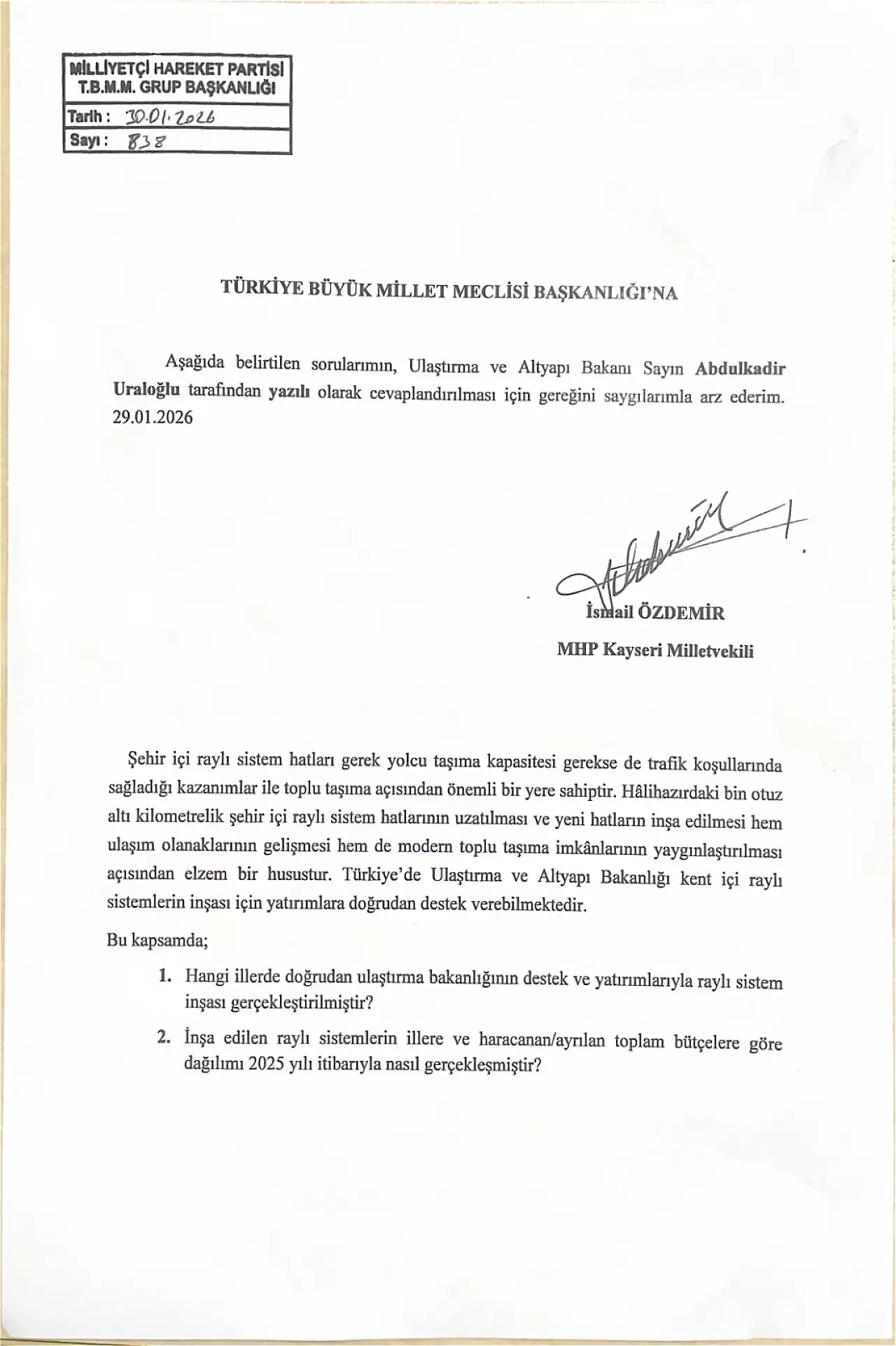 Milliyetçi Hareket Partisi Kayseri Milletvekili İsmail Özdemir, Kayseri ve Türkiye genelindeki ulaşım yatırımlarına ilişkin Ulaştırma ve Altyapı Bakanı Abdulkadir Uraloğlu'na yanıtlaması üzere 2 ayrı yazılı soru önergesi verdi.