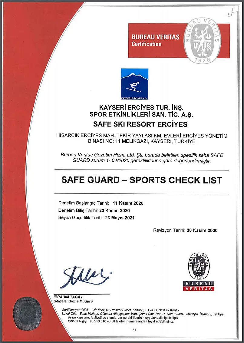 Yaz boyunca Covid-19 pandemisi ile mücadelede 360 derece güvenli ortam oluşturmak maksadıyla tüm tedbirleri alarak hazırlıklarını tamamlayan Kayseri Erciyes Kayak Merkezi’ne, 193 yıldır faaliyetlerini sürdüren ve global çapta en yetkin uluslararası kuruluş olan Bureau Veritas tarafından güvenli kayak merkezi (Safe Ski Resort) sertifikası verildi. Erciyes, dünyada bu belgeyi alan ilk ve tek kayak merkezi oldu.