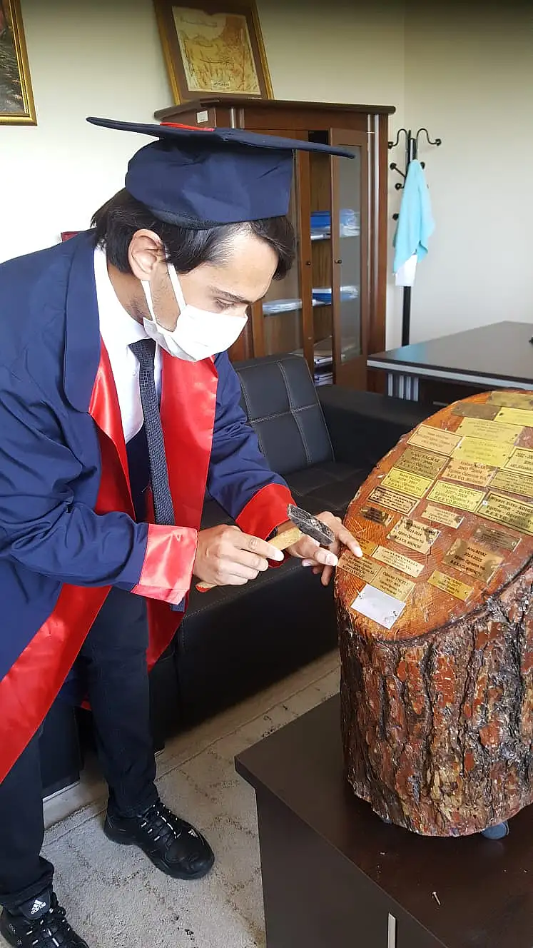 Daha sonra Mert Can Güleç yaş kütüğüne adının yazılı olduğu dönem isimliğini çaktı, daha sonra da mezuniyet plaketini aldı. Mert Can Güleç, 5 yıl önce okulu kazandığında verdiği ‘Adımı o okul kütüğüne çaktıracağım ve okul birincisi olarak mezun olacağım’ sözünde durduğunu, şimdi önünde diğer hedeflerinin bulunduğunu belirterek tüm hocalarına teşekkür etti.