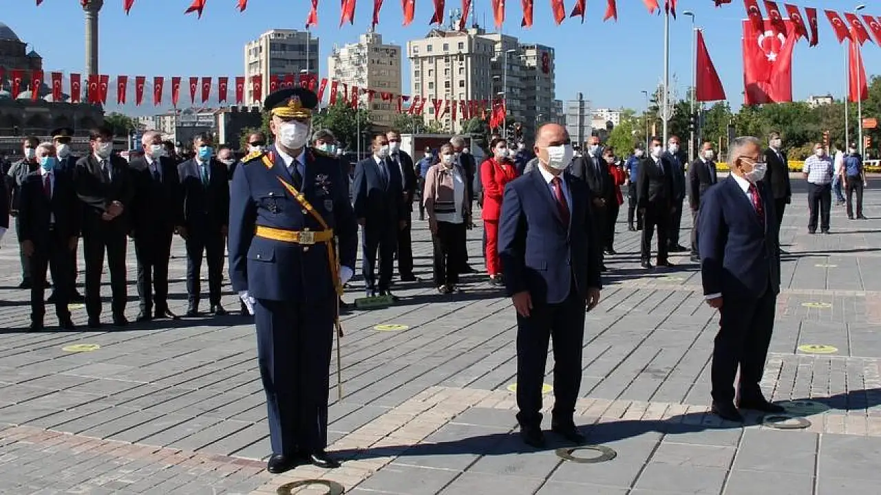 Cumhuriyet Meydanında saygı duruşu ve İstiklal Marşı okunmasının ardından yapılan çelenk koyma törenine Kayseri Valisi Şehmus Günaydın, Kayseri Büyükşehir Belediye Başkanı Memduh Büyükkılıç, Garnizon Komutanı Tuğgeneral Aziz Adalı, siyasi parti İl Başkanları , protokol üyeleri ve vatandaşlar katıldı. Çelenk koyma töreninin ardından Kartal Şehitliği’nde dua edilerek, protokol tarafından şehit mezarlarına karanfil bırakıldı.