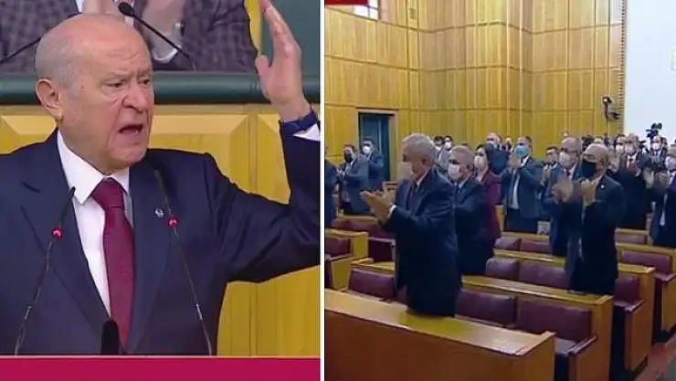 Bahçeli konuşmasının devamında, "Yeter artık, sabır taşı çatladı, bıçak kemiğe dayandı. Bu mesele varoluş yok oluş meselesidir. İp inceldiği kadar incelmiştir, kopacağı varsa zaten kopacaktır" derken, parti grubu alkışlarla ayağa kalktı.