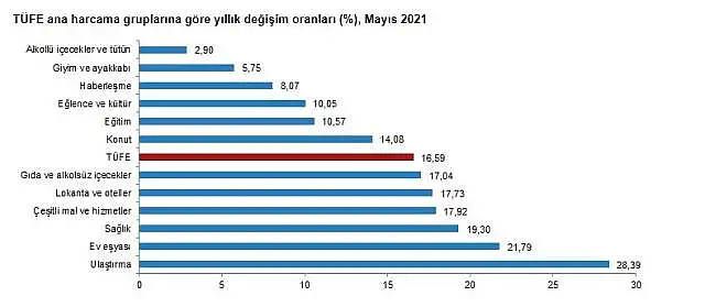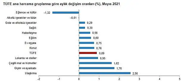 Aylık TÜFE'ye göre 8 ana grup daha düşük, 4 ana grup daha yüksek değişim gösterdi. Aylık en yüksek düşüş gösteren grup %1,32 ile eğlence ve kültür oldu. Ana harcama grupları itibarıyla 2021 yılı Mayıs ayında azalış gösteren diğer ana grup %0,01 ile alkollü içecekler ve tütün oldu. En az artış gösteren diğer ana gruplar %0,29 ile gıda ve alkolsüz içecekler ve %0,30 ile sağlık oldu. Buna karşılık, 2021 yılı Mayıs ayında artışın yüksek olduğu gruplar ise sırasıyla, %2,56 ile ulaştırma, %1,76 ile giyim ve ayakkabı ve %1,62 ile çeşitli mal ve hizmetler oldu.