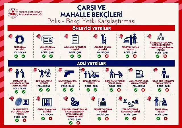 İçişleri Bakanlığı bekçilerle polislerin yetkileri arasındaki farkı gösteren bir tablo paylaştı. Tabloda sadece polisin yapacağı görevler ile bekçi ve polislerin ortaklaşa yapacağı görevlere yer verildi.