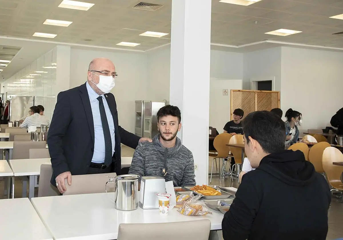 Yeni eğitim-öğretim yılında yüz yüze derslerin başlaması ile birlikte kampüste öğrencilerle sık sık bir araya gelen ve öğrencileri dinleyen Rektör Prof. Dr. Kurtuluş Karamustafa, öğrenci yemekhanesini gezdi. Burada öğrencilerle birlikte öğle yemeği yiyen Rektör Karamustafa, yemek masalarını tek tek dolaşarak öğrencilerle sohbet etti.