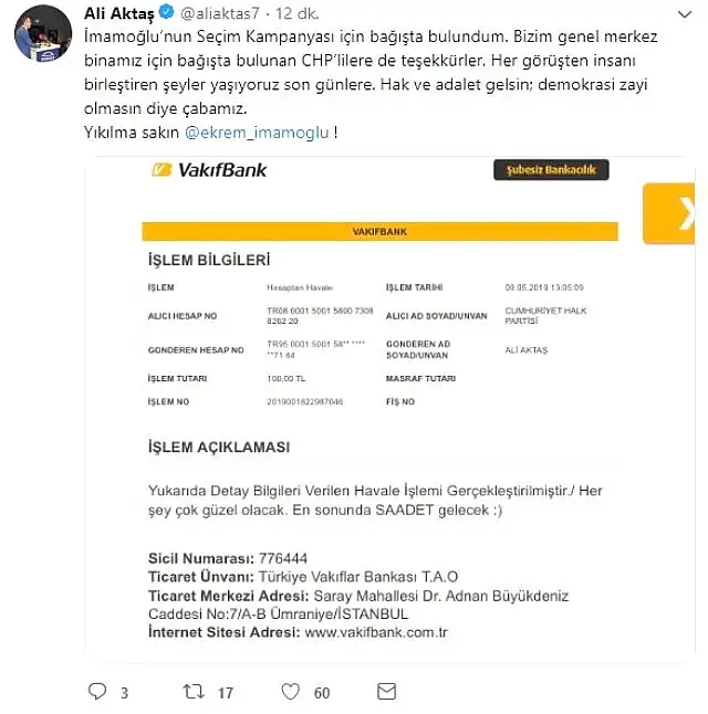 İmamoğlu'nun Seçim Kampanyası için bağışta bulundum. Bizim genel merkez binamız için bağışta bulunan CHP'lilere de teşekkürler. Her görüşten insanı birleştiren şeyler yaşıyoruz son günlere. Hak ve adalet gelsin; demokrasi zayi olmasın diye çabamız. Yıkılma sakın Ekrem İmamoğlu.