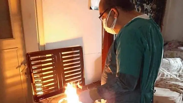 Kayseri İl Sağlık Müdürlüğü'nün Evde Sağlık Hizmetleri biriminde çalışan sağlık memuru Ali Tomu, muayene ettiği 85 yaşındaki Aydın Deliak'ın 'sobamı yakın' talebi üzerine sobayı yakarak ısınmasını sağladı.