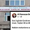 İl Sağlık Müdürü Ali Ramazan Benli, sosyal medya hesabı üzerinden korona virüs nedeniyle hayatını kaybeden 38 ve 48 yaşındaki iki vatandaşın fotoğrafını paylaştı. Paylaşımında "Son 3 günde covid nedeniyle aramızdan ayrılan 2 güzel insan. Yaşları 38 ve 48 idi. Sözün bittiği yer. Rabbim mekanlarını cennet , makamlarını âli eylesin" yazan Benli, korona virüse dikkat çekti.
