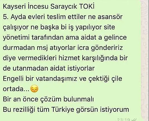 TOKİ binalarının etrafındaki yol problemi çözüldü fakat camiye atanan imam tekrar gittiği için halkın bu konuda mağduriyeti devam ediyor. 434 konutlu TOKİ sakinlerinin sıkıntısı sadece bunlarla sınırlı değil. Sağlık ocağının hizmet vermemesi, okula gidecek öğrencinin olması ama okulun eksiklerinin bitmemesi, İncesu’da bulunan okulun Saraycık TOKİ’ye uzak olması sebebiyle asgari ücret ile geçinen aileleri maddi açıdan zorlayacak kadar yüksek servis ücretlerinin olması, binalarda asansör olmadığı için yaşlı ve engelli vatandaşların zorlanması da sebepler arasında yerini alıyor. TOKİ sakinleri de haber merkezimize ulaşarak sıkıntılarını dile getirdi. Sıkıntısı olan bir vatandaş haber merkezimize yaptığı açıklamalarda “Kayseri İncesu Saraycık TOKİ’yi Aralık ayında teslim etmeleri gerekirken, Mayıs ayında evleri teslim ettiler. Binalarda asansör çalışmıyor ama site yönetimi ev sahiplerine icra gönderme tehdidi ile aidatları topluyor. Hizmet vermeden para tahsil ediliyor. Engelli komşumuz asansör olmadığı için merdivenleri zorlanarak inip çıkıyor. Bir an önce sorunlarımızın çözüme kavuşmasını istiyoruz” ifadelerini kullandı.