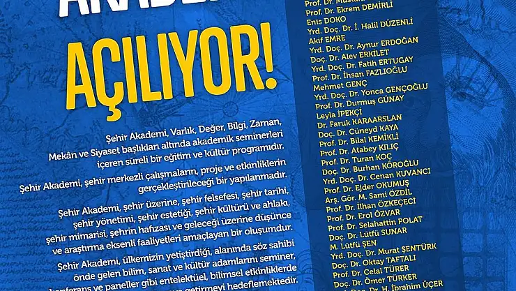 3 Mart Cuma günü açılacak olan Şehir Akademi’de ilk dersi İstanbul Medeniyet Üniversitesi Öğretim Üyesi, Türk Bilim Tarihçisi Prof. Dr. İhsan Fazlığoğlu verecek. Şehir Akademi’de ders verecek isimler arasında Prof. Dr. Köksal Alver, Prof. Dr. Yunus Apaydın, Beşir Ayvazoğlu, Dursun Çiçek, Prof. Dr. İlhan Özkeçeci, Prof. Dr. Erol Özvar, Leyla İpekçi, Akif Emre, Prof. Dr. Ekrem Demirli, Doç. Dr. Alev Erkilet, Prof. Dr. İhsan Fazloğlu, Doç. Dr. Oktay Taftalı ve alanında söz sahibi bilim, sanat ve kültür insanları bulunuyor.