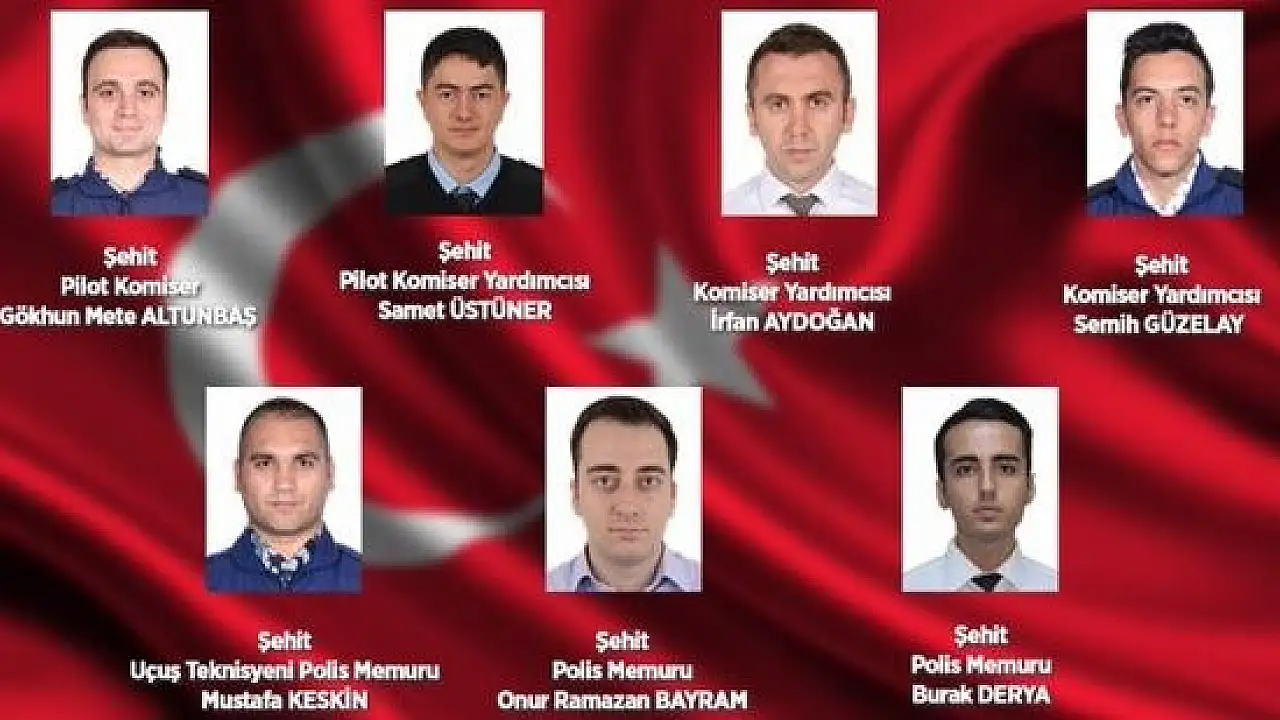 Şehit Pilot Komiser Gökhun Mete Altunbaş, Şehit Pilot Komiser Yardımcısı Samet Üstüner, Şehit Komiser Yardımcısı İrfan Aydoğan, Şehit Komiser Yardımcısı Semih Güzelay, Şehit Uçuş Teknisyeni Polis Memuru Mustafa Keskin, Şehit Polis Memuru Onur Ramazan Bayram ve Şehit Polis Memuru Burak Derya