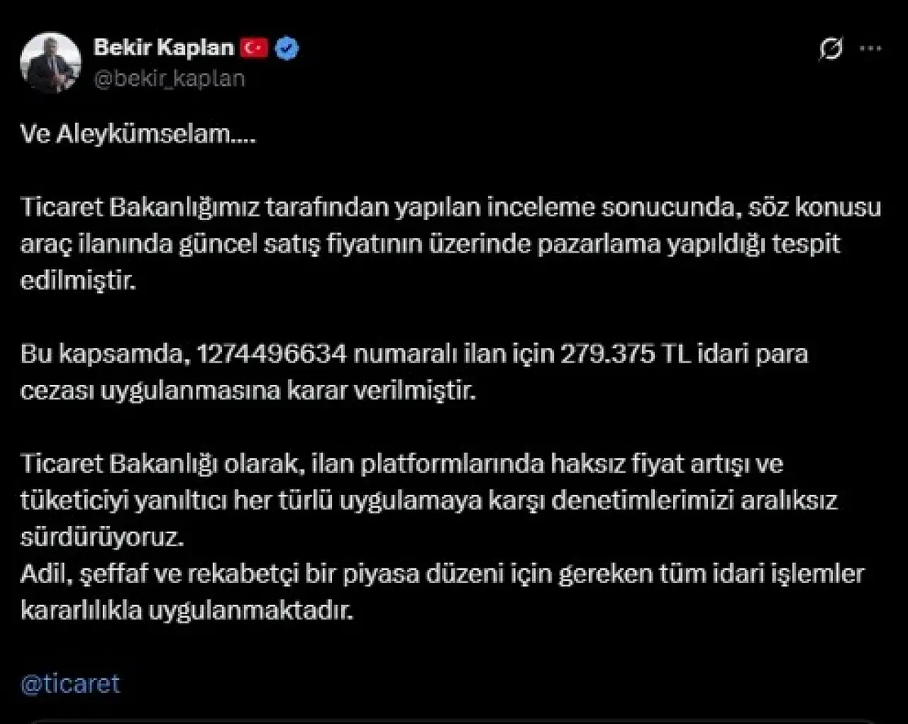 “Ve Aleykümselam…. Ticaret Bakanlığımız tarafından yapılan inceleme sonucunda, söz konusu araç ilanında güncel satış fiyatının üzerinde pazarlama yapıldığı tespit edilmiştir. Bu kapsamda, 1274496634 numaralı ilan için 279.375 TL idari para cezası uygulanmasına karar verilmiştir. Ticaret Bakanlığı olarak, ilan platformlarında haksız fiyat artışı ve tüketiciyi yanıltıcı her türlü uygulamaya karşı denetimlerimizi aralıksız sürdürüyoruz. Adil, şeffaf ve rekabetçi bir piyasa düzeni için gereken tüm idari işlemler kararlılıkla uygulanmaktadır.”