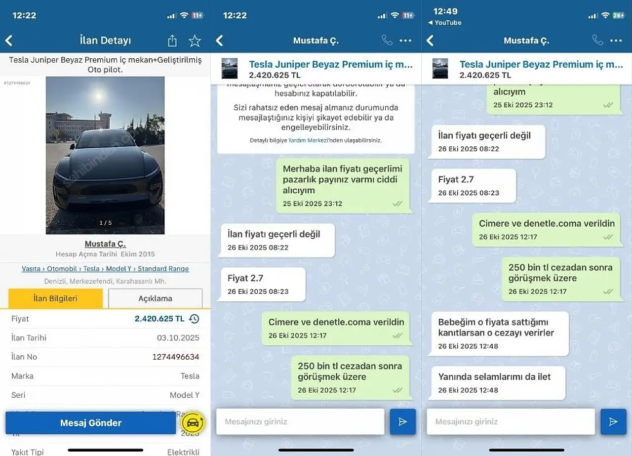 İnternette Tesla marka aracını 2 milyon 420 bin liradan satışa çıkaran Mustafa Ç. isimli kullanıcı, aracı satın almak için kendisi ile iletişime geçen alıcıdan ilan fiyatının geçerli olmadığını ve aracın fiyatının 2 milyon 700 bin TL olduğunu söyleyerek 280 bin lira daha fazla fiyat istedi. Alıcının Mustafa Ç.’ye attığı mesajlarda kendisini şikayet ettiğini ve ceza alacağını söyledi. Mesajları ciddiye almayan Mustafa Ç. isimli satıcı, "Bebeğim o fiyata sattığımı kanıtlarsan o cezayı verirler. Yanında selamlarımı da ilet" şeklinde alıcıya yanıt verdi.