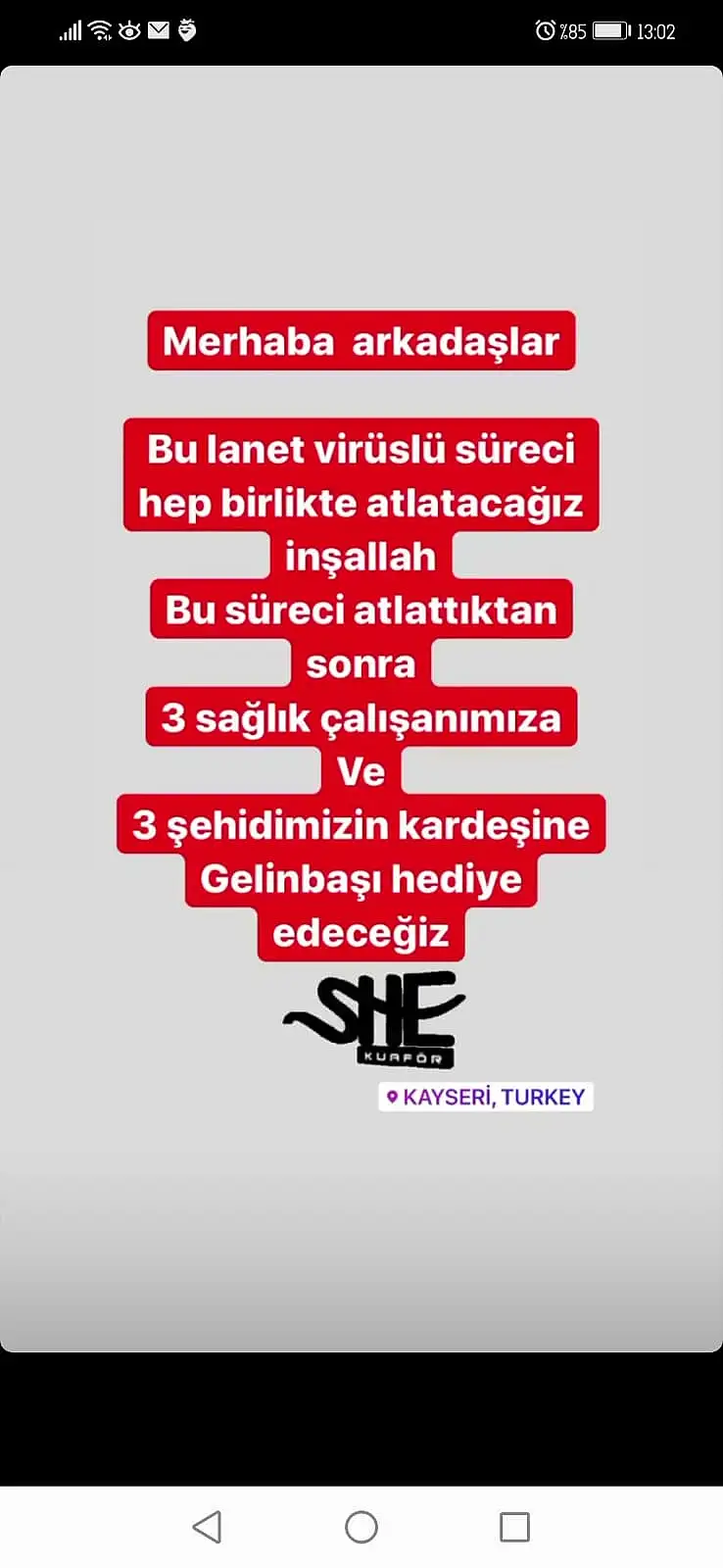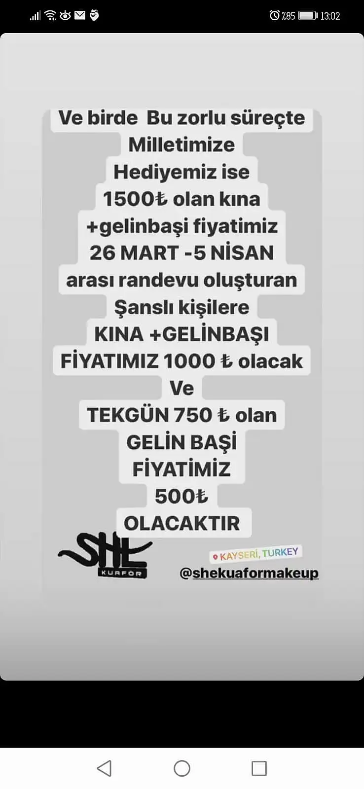 Yeni tip koronavirüsün yayılmasını engellemek ve vatandaşları korumak amacıyla yapılan işlem sırasında birçok kez fiziksel temasın olması nedeniyle, berber, güzellik salonu/merkezi, kuaför gibi iş yerlerinin faaliyetleri geçici süreliğine durdurulmuştu. Bu sebeple hizmetine ara veren She Kuaför yetkilisi Uğur Burhaniye’de sosyal medyada bir kampanya başlattı. Burhaniye yaptığı paylaşımda şu ifadelere yer verdi: “Merhaba arkadaşlar, bu virüslü süreci hep birlikte atlatacağız inşallah. Bu süreci atlattıktan sonra 3 sağlık çalışanımıza ve 3 şehidimizin kardeşine gelin başı hediye edeceğiz. Ayrıca bu zorlu süreçte milletimize hediyemiz ise 1500 TL olan kına ve gelinbaşı fiyatımız 25 Mart-5 Nisan arası randevu oluşturan şanslı kişilere fiyatımız 1000 TL olacak. Tek gün gelinbaşı 750 TL olan fiyatımızı ise 500 TL olacaktır” dedi.