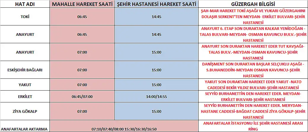 Cumartesi ve Pazar günleri Büyükşehir Belediyesi otobüsleriyle de farklı mahallelerden Şehir Hastanesi istikametine seferler yapılacak. Buna göre; TOKİ-Şehir Hastanesi istikametinde 06.45’te, Anayurt-Şehir Hastanesi istikametinde 06.45 ve 07.00’de, Eskişehir Bağları-Şehir Hastanesi istikametinde 07.00’da, Yakut Mahallesi-Şehir Hastanesi istikametinde 07.00’da, Erkilet Şehir Hastanesi istikametinde 06.45 ve 07.00’de, Ziya Gökalp-Şehir Hastanesi istikametinde ise 07.00’de otobüs seferleri gerçekleştirilecek. Bu otobüslerin geri dönüşleri ise 14.45’ten itibaren başlayacak ve 15.00’de sona erecek. Raylı sistemden Şehir Hastanesi’ne Anafartalar İstasyonu’ndan aktarmalar ise seferlerin hemen ardından yapılacak.