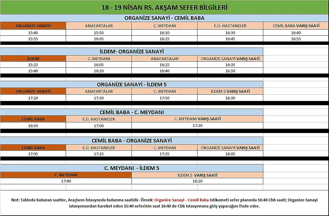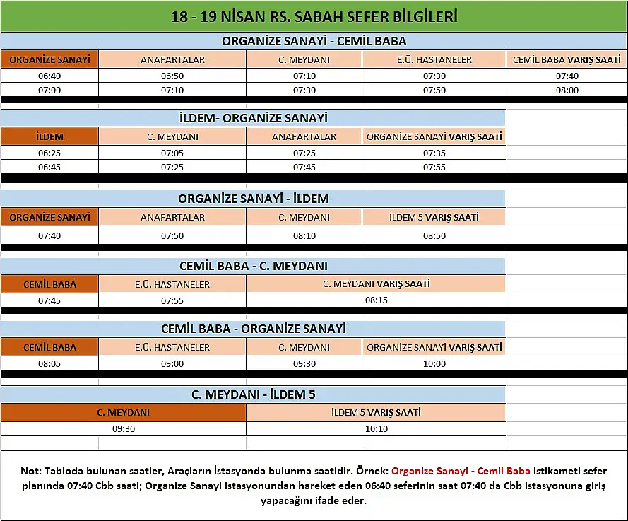 Yapılan planlamaya göre raylı sistem araçları sabah 06.40 ve 07.00’de Organize Sanayi-Cemil Baba arasında 07.40’da Organize Sanayi-İldem hattında, 06.25 ve 06.45’te İldem-Organize Sanayi Hattında, 07.45’te Cemil Baba-Cumhuriyet Meydanı hattında, 08.05’te ise Cemil Baba-Organize Sanayi Hattında sefer yapacak. Raylı sistem araçları öğleden sonra ise 15.40 ve 15.55’te Organize Sanayi-Cemil Baba arasında 17.20’de Organize Sanayi-İldem hattında, 15.25 ve 15.40’da İldem-Organize Sanayi Hattında, 16.50’de Cemil Baba-Cumhuriyet Meydanı hattında, 17.40’da ise Cemil Baba-Organize Sanayi Hattında hizmet verecek. 18 Nisan Cumartesi ve 19 Nisan Pazar günü bu saatler dışında raylı sistem araçları çalışmayacak.