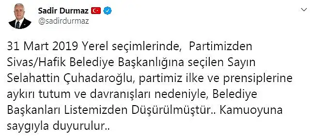 31 Mart 2019 Yerel seçimlerinde,Partimizden Sivas/Hafik Belediye Başkanlığına seçilen Sayın Selahattin Çuhadaroğlu, partimiz ilke ve prensiplerine aykırı tutum ve davranışları nedeniyle, belediye başkanları listemizden düşürülmüştür. Kamuoyuna saygıyla duyurulur.