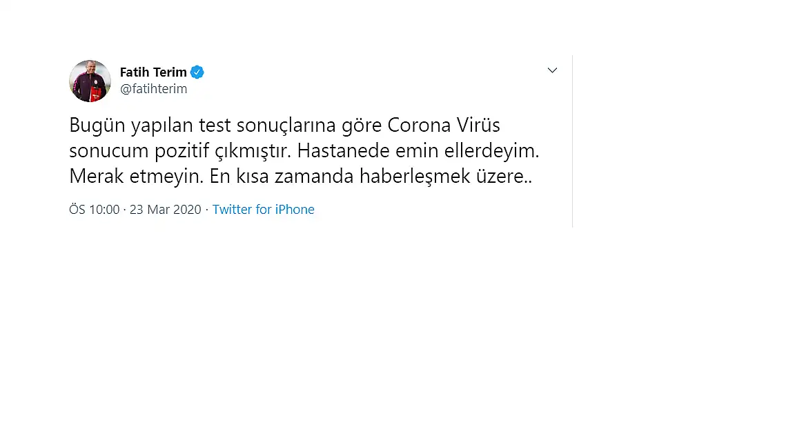Terim: "Bugün yapılan test sonuçlarına göre Corona Virüs sonucum pozitif çıkmıştır. Hastanede emin ellerdeyim. Merak etmeyin. En kısa zamanda haberleşmek üzere" dedi.