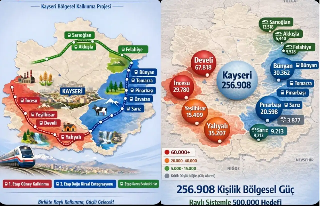 Kenanoğlu, KAYBAN 12’nin yalnızca bir ulaşım projesi olmadığını belirterek, 5 yıllık hedefler arasında ilçelere yatırım artışı, organize sanayi bölgelerinin genişlemesi, tarımsal lojistik merkezlerinin kurulması, turizm rotalarının oluşturulması ve genç nüfusun geri dönüşünün yer aldığını açıkladı. 10-15 yıllık perspektifte ise söz konusu 12 ilçenin toplam nüfusunun 256 binden 400 binin üzerine çıkarılmasının, uzun vadede ise 500 bin nüfus potansiyeline ulaşılmasının öngörüldüğünü aktardı. Kenanoğlu açıklamasını, “Bu bir hayal değil; ulaşım demek ekonomi, nüfus ve istihdam demektir. Göç duracak, üretim artacak, turizm canlanacak. 256 bin insanımız rayla şehre bağlanacak. KAYBAN 12 sadece bir tren projesi değil Kayseri’nin dengeli, adil ve bütüncül kalkınma hamlesidir” sözleriyle tamamladı.