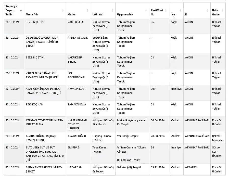Tarım ve Orman Bakanlığı, denetimler sonrası örnek alınan ürünleri laboratuvarlarında test ediyor ve ürünlerin içindeki maddeleri tespit ediyor. Et, zeytinyağı, bal, lahmacun, kebap ve sucuk gibi ürünlerde sıklıkla taklit ve tağşişe rastlanıyor. Afyonkarahisar merkezli piliç sucuk üreten firmanın ürünlerinde mekanik ayrılmış kanatlı eti, Aksaray merkezli et sucuk üreten firmanın ürünlerinde dil tespit edilirken Bakanlığın yayımladı listede Kayserili firma yer almadı.