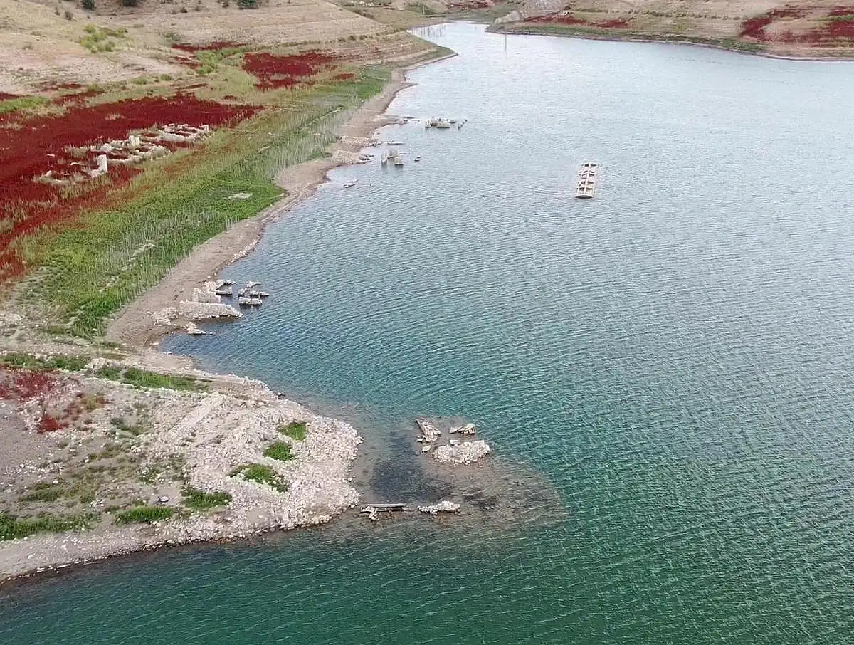 Kayseri’nin Kocasinan ilçesinde baraj sularının çekilmesiyle beraber su altında kalan eski Mollahacı köyünün bir kısmı gün yüzüne çıktı.