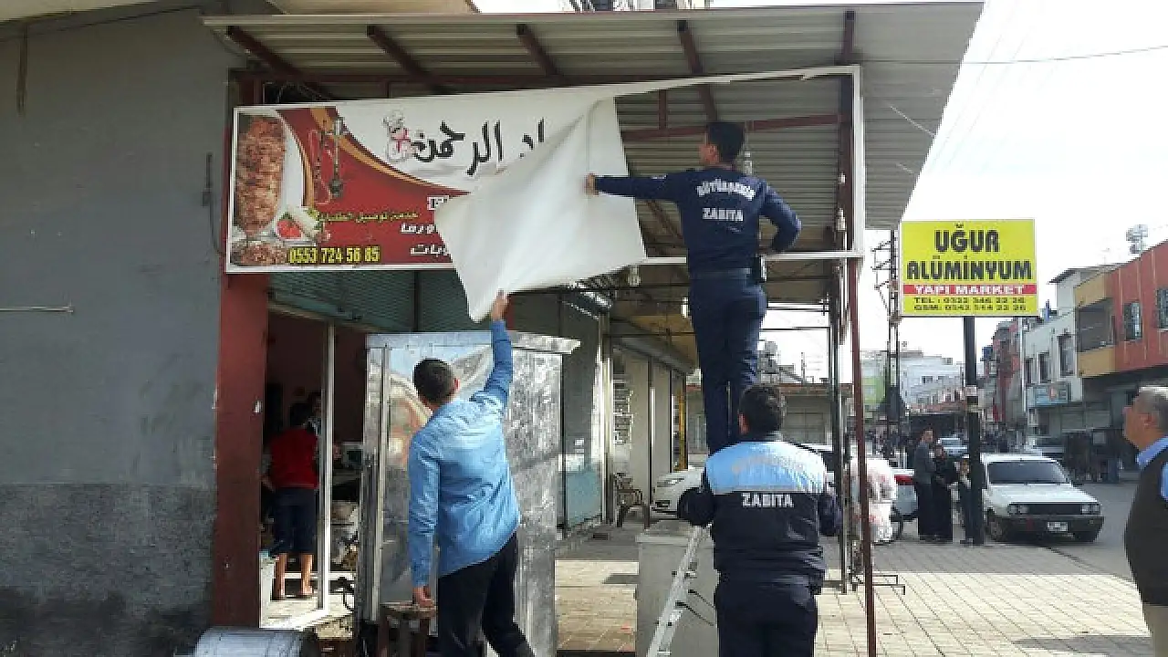 Adana Büyükşehir Belediyesi, kent genelinde faaliyet gösteren Suriyelilerin işletmelerinde bulunan Arapça tabelaları kaldırdı.