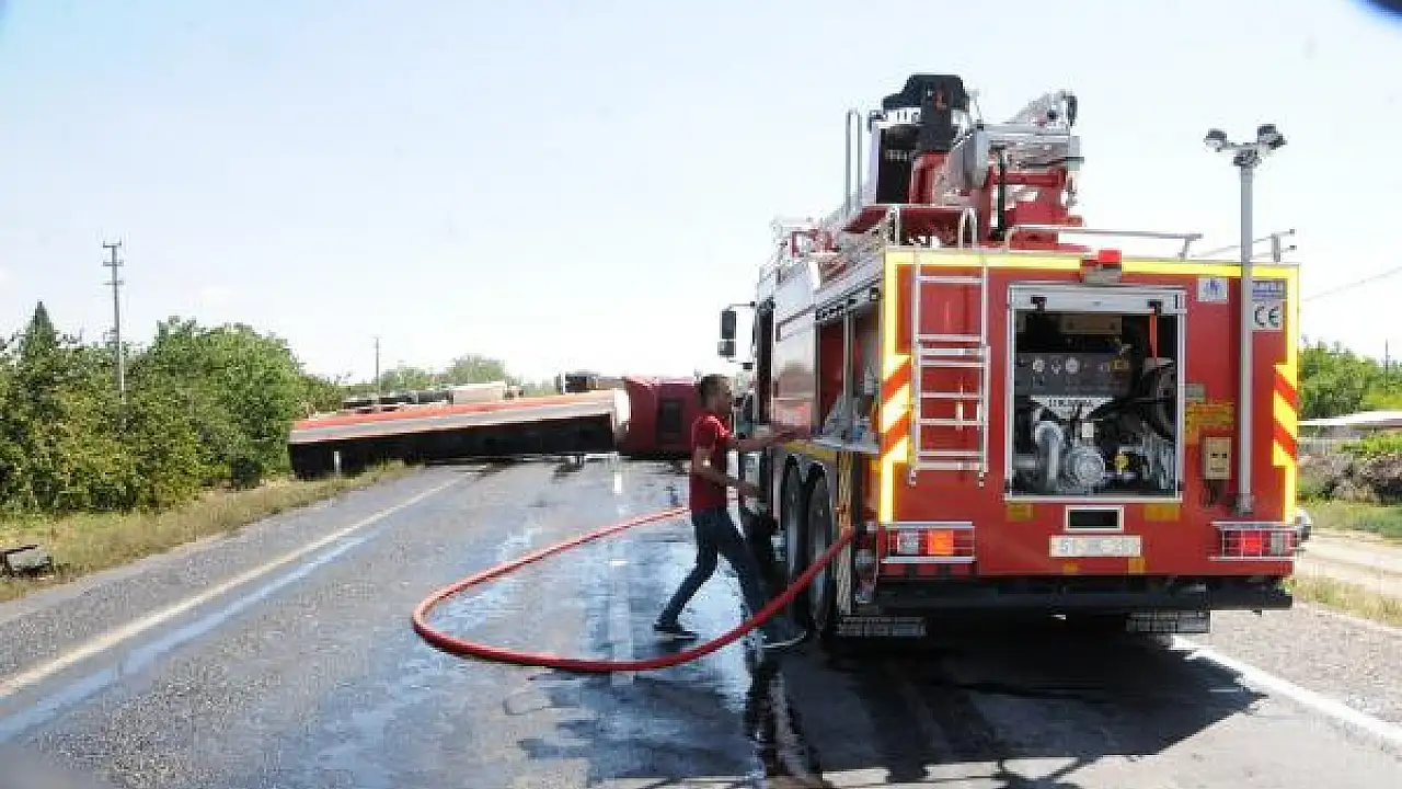 NİĞDE’de arı sokması nedeniyle baygınlık geçiren şoförün kullandığı tanker devrilerek yan yattı.