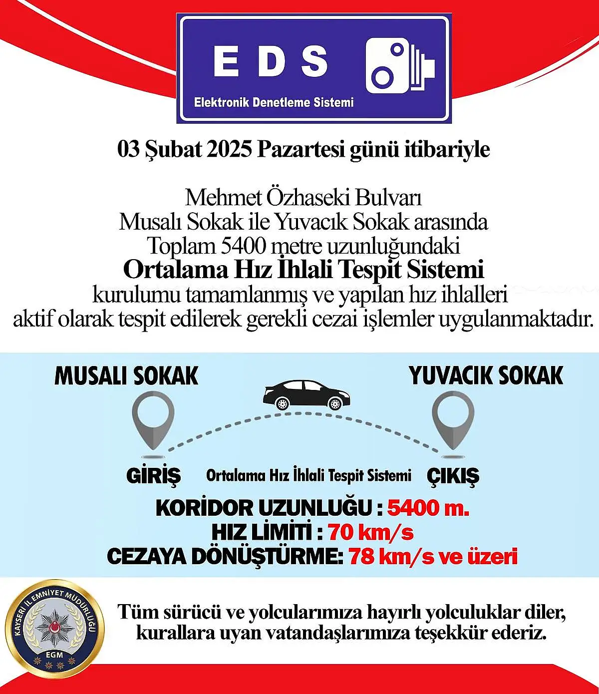 Kayseri İl Emniyet Müdürlüğü tarafından pazartesi günü itibariyle Mehmet Özhaseki Bulvarı Musalı Sokak ile Yuvacık Sokak arasında toplam 5 bin 400 metre uzunluğunda ortalama hız ihlali tespit sistemi kurulumu tamamlandı.