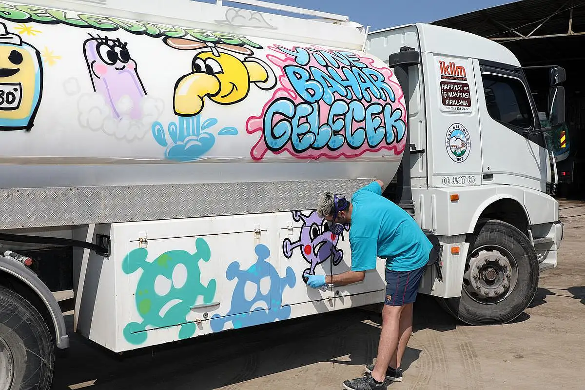 Koronavirüs salgınına karşı hijyen ve dezenfeksiyon çalışmalarını aralıksız sürdüren Talas Belediyesi, dikkat çeken bir uygulamaya daha imza attı. 50 bin maske, 30 bin kitap ve 10 bin hijyen çantası dağıtımı gibi beğeni toplayan çalışmalara bir yenisini daha ekleyen Talas Belediyesi, temizlik işlerinde kullanılan araçlara grafiti uygulayarak farkındalık oluşturdu. Belediyenin iki dezenfekte ve iki yol süpürme araçlarına grafiti ile “Gadasını aldığım evde gal”, “Söz sana, yine bahar gelecek”, “Önce tedbir, önce hijyen”, “Hayat eve sığar, evde kal” sloganları yazılarak hem toplumsal mesaj verildi hem de yüzlere tebessüm ettirildi.