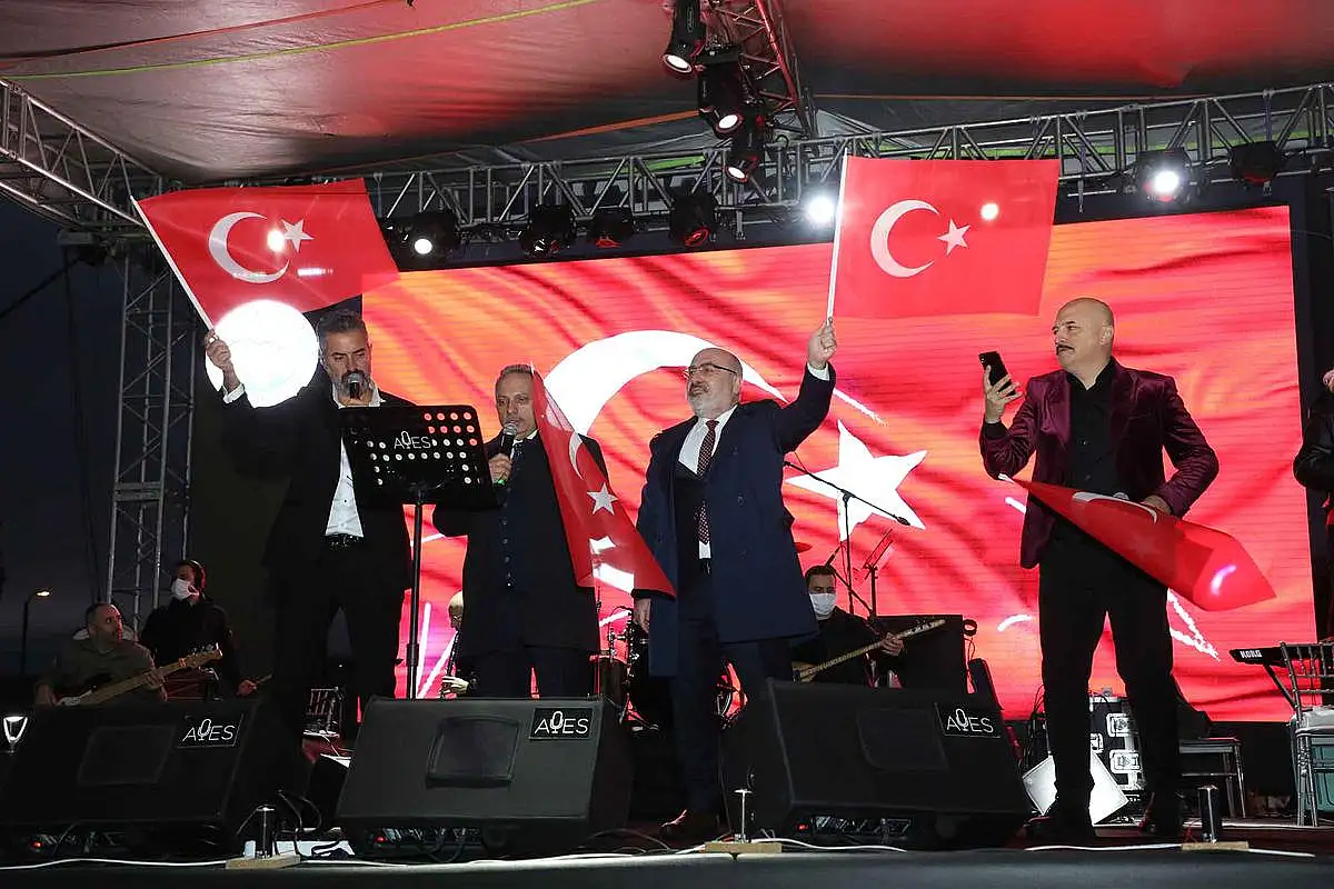 Konserin sonunda Başkan Yalçın, Turgay Başyayla ve Yavuz Seçkin’e çiçek hediye ederken, Türk bayrağıyla alandakileri selamladı.