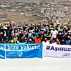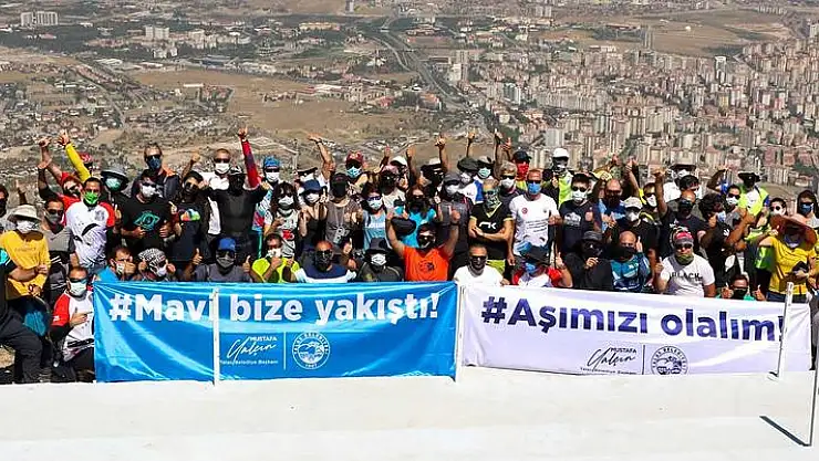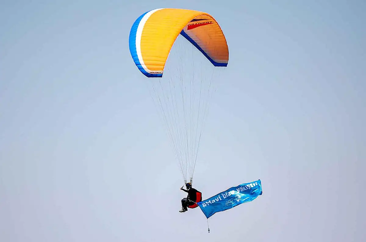 Paraşütlerinin altına bağladıkları “Aşımızı olalım” ve “Mavi bize yakıştı” yazılı pankartlarla Ali Dağı’nın zirvesinden havalanan pilotlar, ilçe üzerinde tur atarak farkındalık oluşturdu.