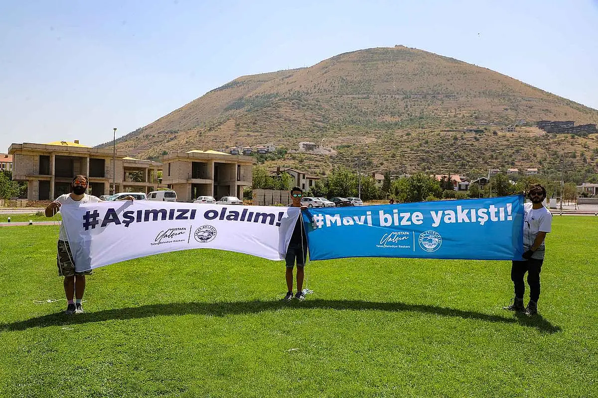 Talas Belediye Başkanı Mustafa Yalçın imzalı iki pankartın birinde ‘Aşımızı olalım’ çağrısı yapılırken bir diğerinde de mavi kategoriye yükselen Kayseri’den dolayı ‘Mavi Bize Yakıştı’ sloganı yer aldı.