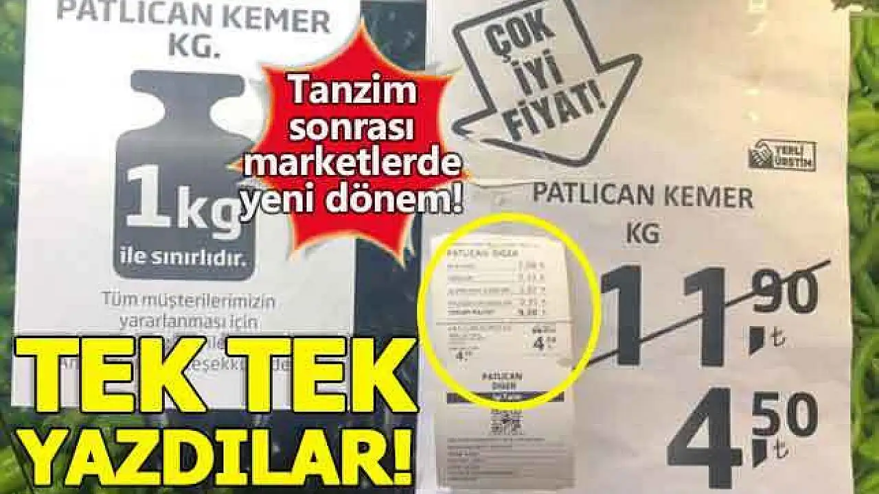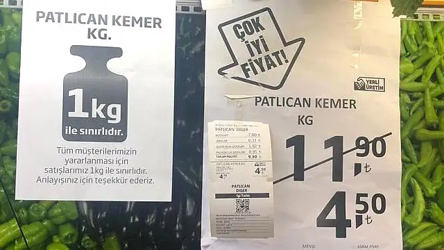 Marketlerin fiyat etiketlerine ekledikleri 'maliyet' tablosu zararına satış yaptıklarını açık bir şekilde gösteriyor. Örneğin, patlıcanın kilosu 11,90 iken yüzde 50'yi aşan indirimle 4,50 TL'ye satılıyor. Maliyet etiketinde ise patlıcanın 7 liraya alındığı, üzerine 0,33 TL vergi, 1,02 TL sevkıyat, 0,95 TL mağazacılık giderleri eklendiğinde 1 kilo patlıcanın maliyeti 9.30 liraya çıkıyor. Marketler ise 'fiyat düşürün' baskısı ve tanzim rekabeti nedeniyle kilo sınırlaması getirerek patlıcanı zararına 4,50 liraya satıyor. Bu nedenle de satışa "Tüm müşterilerimizin yararlanabilmesi için satışımız 1 kilo ile sınırlıdır" yazısıyla sınırlama koyuyor. Aynı şekilde maliyeti 4,82 lira olan kuru soğan da kilosu 2 liradan satılıyor.