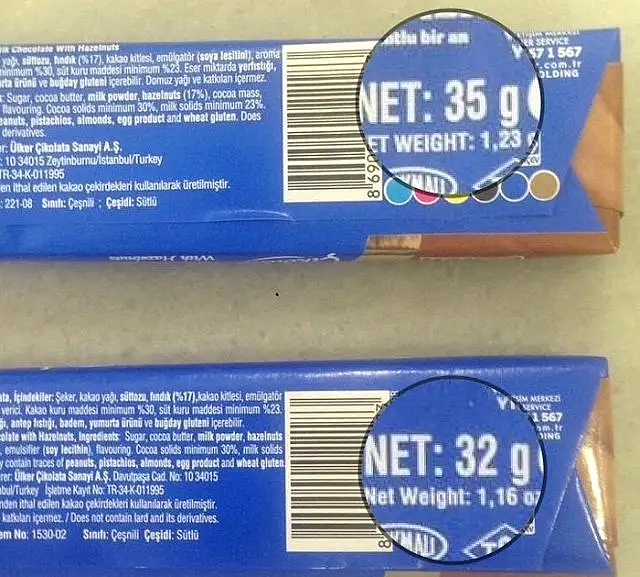 "300 ml ayran 285 ml olmuş ama fiyatı aynı. 700 gramlık kaşar peyniri 600 grama düşmüş ve fiyat artmış: 29.95 TL. Kalınlığı azaltıp uzunluğu artırmışlar. Üstten bakıldığında daha fazla gibi gözüküyor. Oysa hem fiyatı yüksek hem de gramajı düşük. Ayrıca çoklu ambalajlarda daha ucuza aldığınızı düşünürken daha pahalıya geliyor. Maden suyunda çok oluyor. Islak mendil tekli alındığında üçlü pakete göre daha ucuza geliyor. 100, 200, 1000 gram bildiğimiz ürünler 111, 225, 130, 40, 172, gibi küsuratlı gramajlarla satılmaya başladı. Gramaj oyunu özellikle kuruyemiş, çikolata ve şarküteri ürünlerinde yapılıyor. Vatandaş gözünü açsın. Ticaret Bakanlığı'na şikayet etsin."