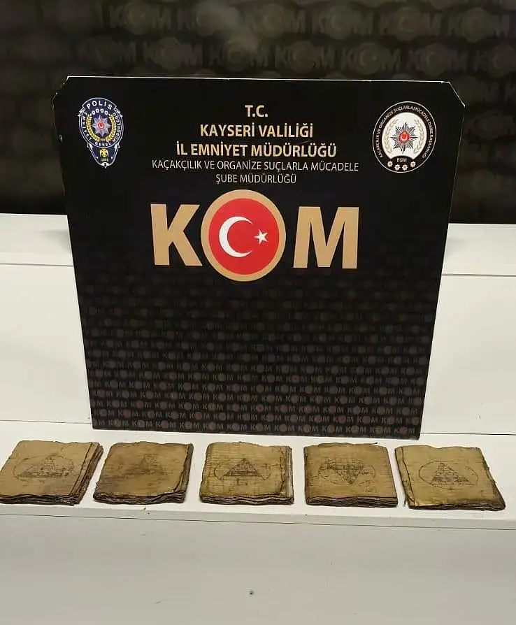 Kayseri’de polis ekipleri tarafından çevre illerden temin ettiği tarihi eserleri Kayseri’de satacağı bilgisi alınan A.A., N.E., M.A., A.S., A.E., S.B. ve A.B. yakalandı. Yapılan aramalarda 5 adet yaklaşık 1800 yıllık Aramice dilinde yazılmış Mısır ve Yahudi dönemlerine ait el yazması kitap ele geçirildi.