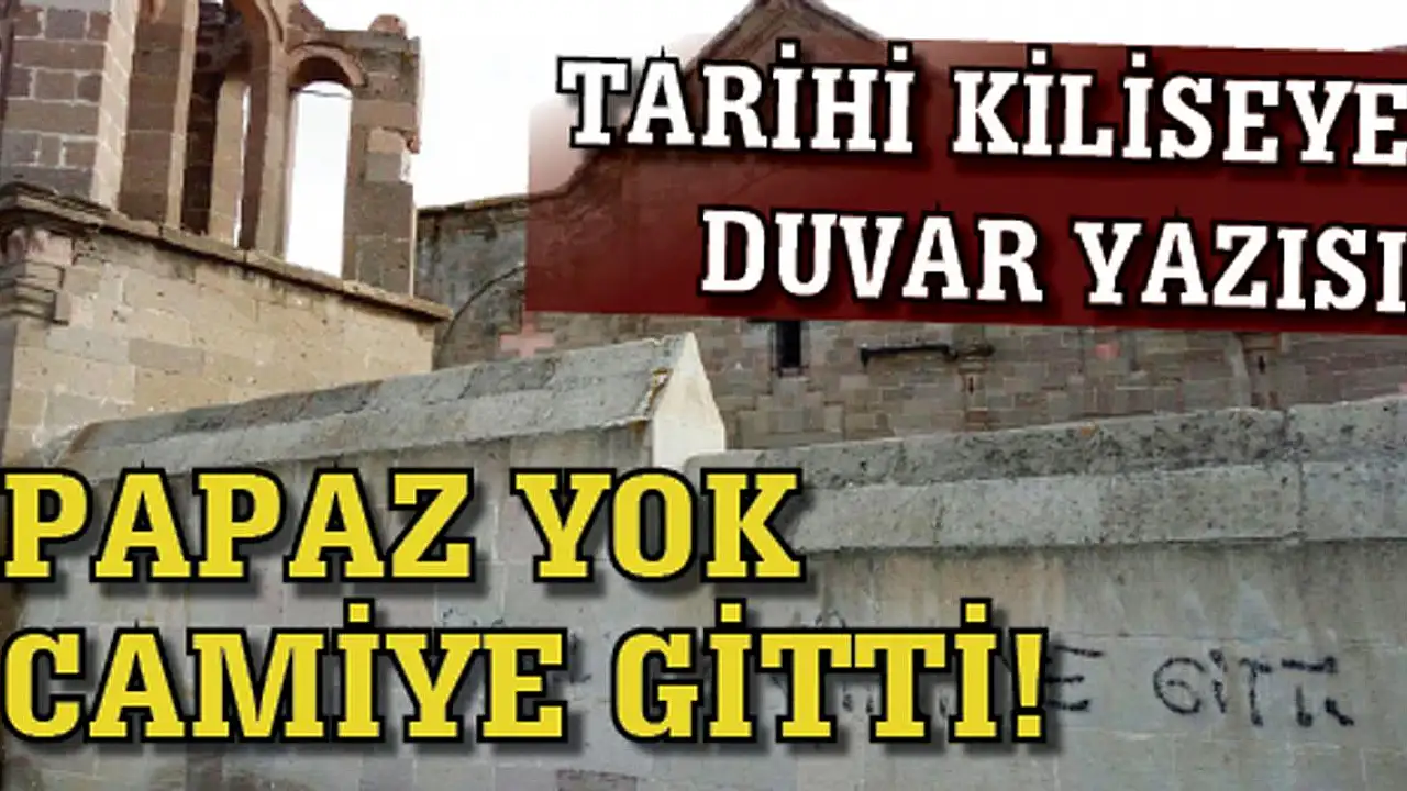 Nevşehir'in Derinkuyu ilçesinde yer alan tarihi Aziz Theodoros Trion Kilisesi'nin duvarına köpek resmi çizip, 'Papaz yok camiye gitti' yazdılar.Nevşehir'in Derinkuyu ilçesinde her yıl binlerce yerli ve yabancı turistin ziyaret ettiği Aziz Theodoros Trion