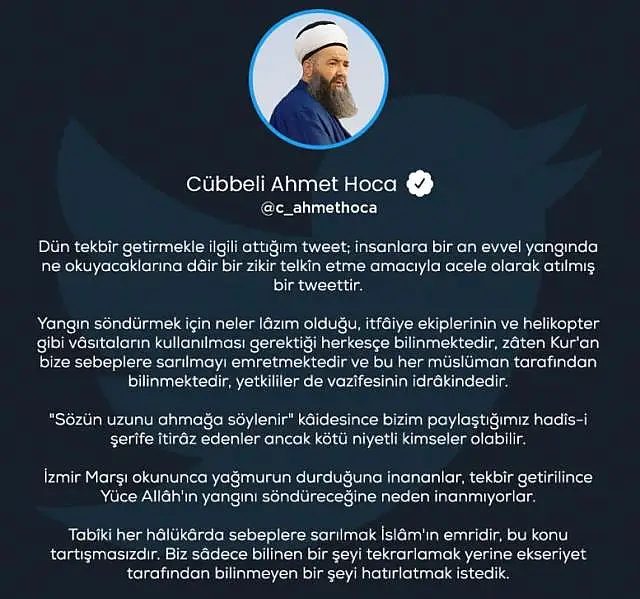 Sosyal medya hesabından "Yangın gördüğünüz zaman tekbir getirin, zira tekbir gerçekten onu söndürür" paylaşımı yapan Cübbeli Ahmet Hoca, sosyal medyanın gündemine oturdu. Konuyla ilgili bir paylaşım daha yapan Cübbeli "Dün tekbir getirmekle ilgili attığım tweet; insanlara bir an evvel yangında ne okuyacaklarına dair bir zikir telkin etme amacıyla acele olarak atılmış bir tweettir" ifadelerini kullandı.