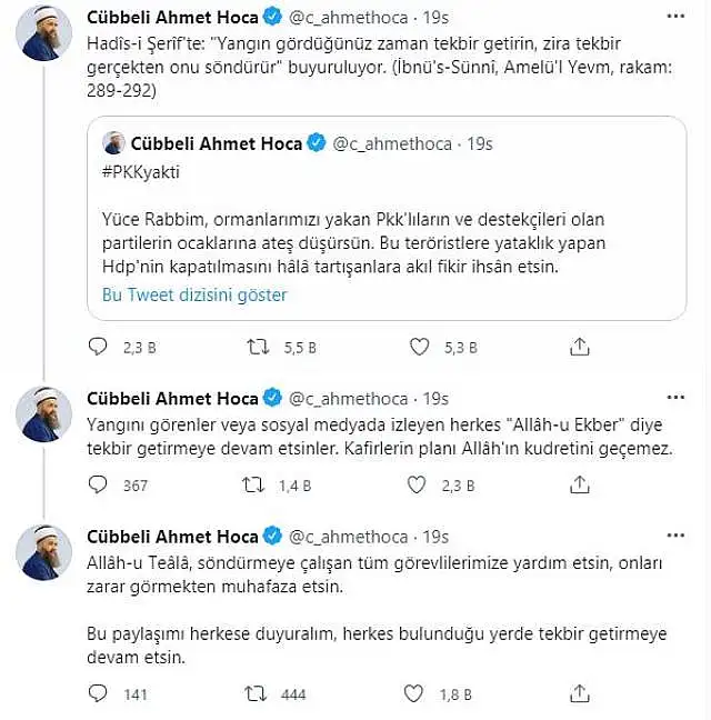 Türkiye'nin birçok noktasında çıkan orman yangılarıyla mücadele sürerken Cübbeli Ahmet Hoca'dan dikkat çeken bir çıkış geldi. Cübbeli, sosyal medya hesabından yaptığı bir paylaşımda "Hadis-i Şerif'te: 'Yangın gördüğünüz zaman tekbir getirin, zira tekbir gerçekten onu söndürür' buyuruluyor" ifadelerine yer verdi.