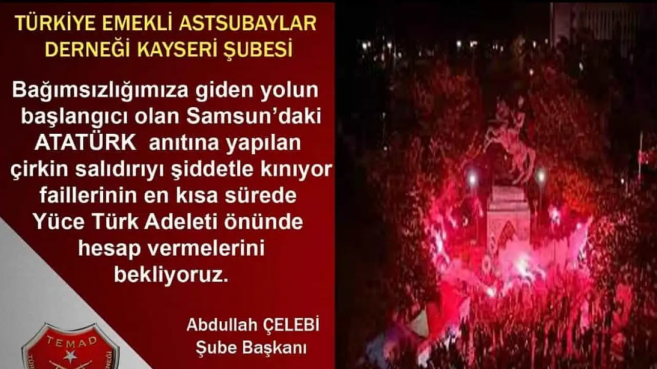Türkiye Emekli Astsubaylar Derneği (TEMAD) Kayseri Şube Başkanı Abdullah Çelebi, Samsun'da Milli Mücadele'nin sembollerinden Onur Anıtı'na düzenlenen çirkin saldırıyı kınadı.