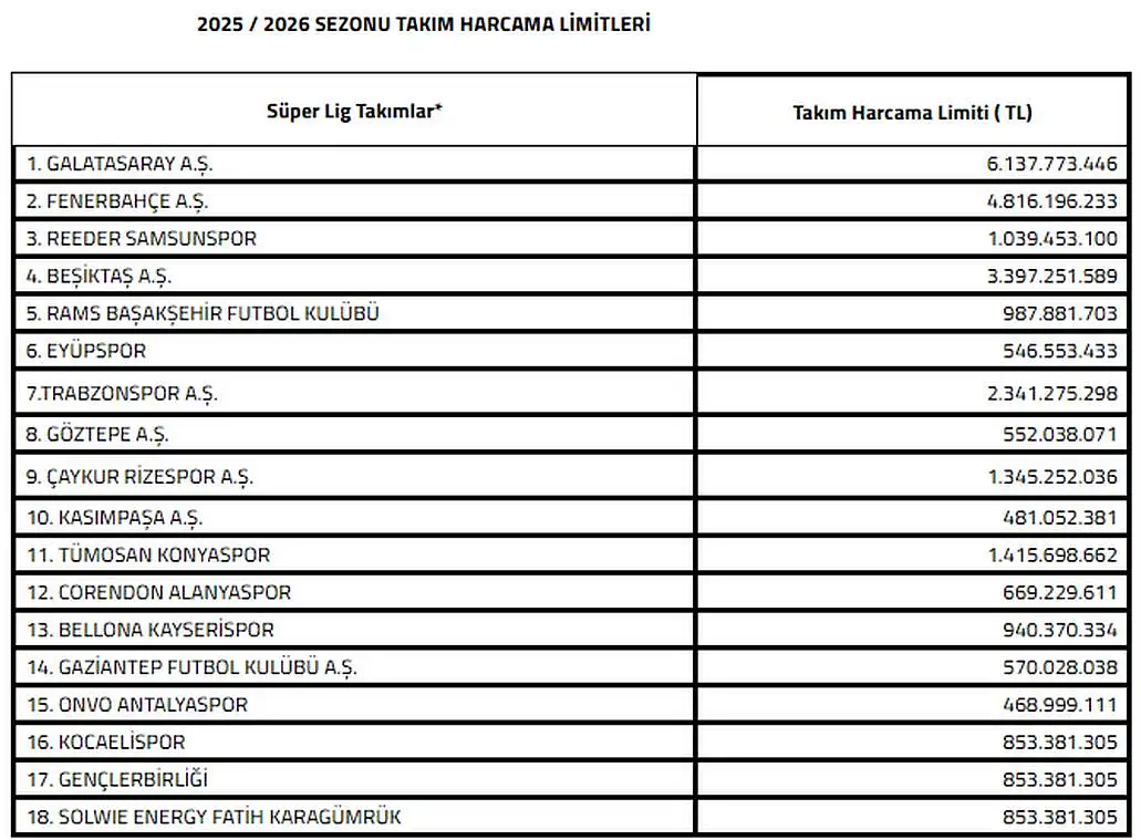 Türkiye Futbol Federasyonu tarafından Süper Lig takımlarının 2025-2026 sezonu harcama limitleri açıklandı. Kayserispor’un harcama limiti 940 Milyon 370 Bin 334 TL olarak duyuruldu. En fazla harcama limiti 6 Milyar 137 Milyon 773 Bin 446 TL ile Galatasaray’ın olurken en az harcama limiti 486 Milyon 999 Bin 111 TL ile Antalyaspor’un oldu.