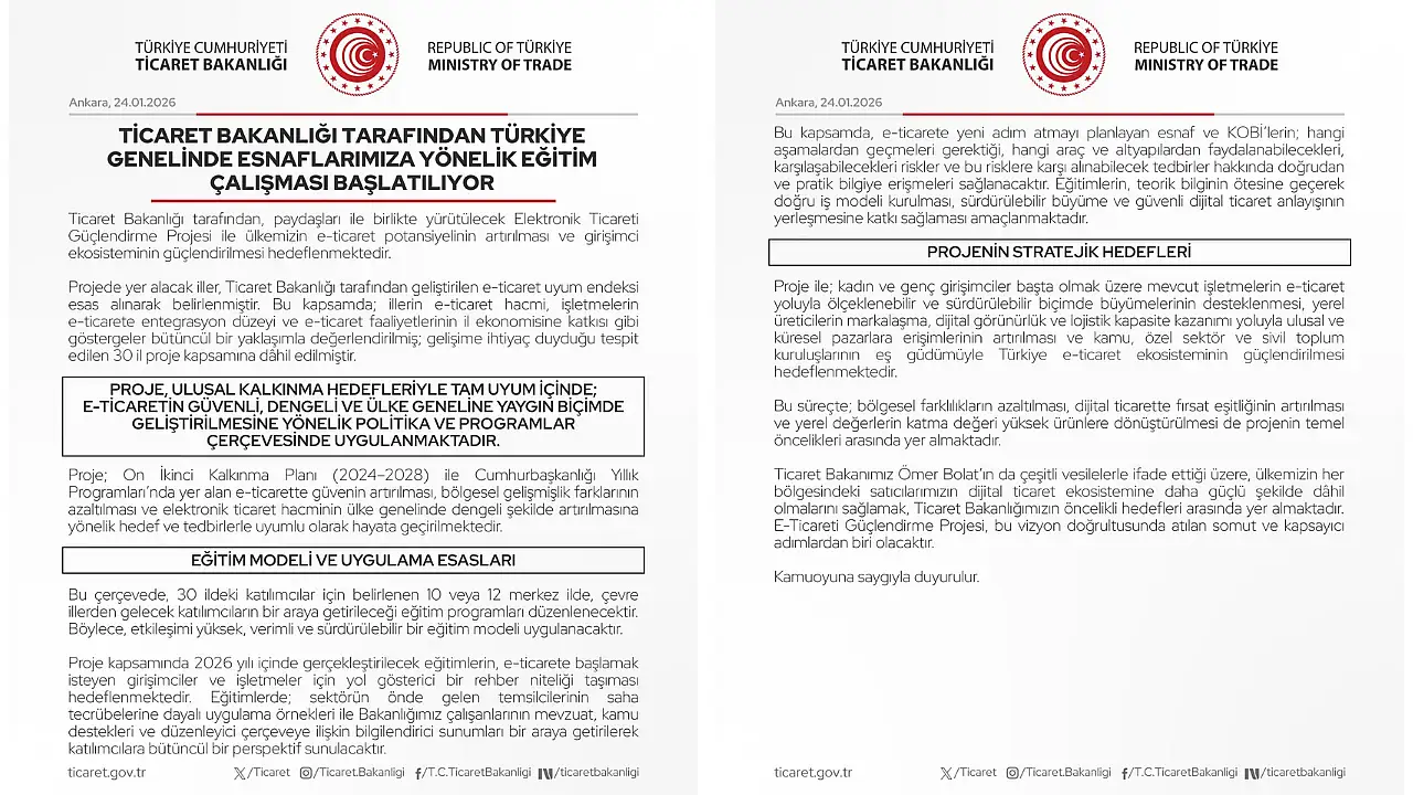 Ticaret Bakanlığı tarafından Türkiye genelinde esnaflara yönelik eğitim çalışması başlatılacak. Bakanlık paydaşları ile birlikte yürütülecek Elektronik Ticareti Güçlendirme Projesi ile e-ticaret potansiyelinin artırılması ve girişimci ekosisteminin güçlendirilmesi hedefleniyor. Projede yer alacak iller, Ticaret Bakanlığı tarafından geliştirilen e-ticaret uyum endeksi esas alınarak belirlendi. Bu kapsamda; illerin e-ticaret hacmi, işletmelerin e-ticarete entegrasyon düzeyi ve e-ticaret faaliyetlerinin il ekonomisine katkısı gibi göstergeler bütüncül bir yaklaşımla değerlendirildi; gelişime ihtiyaç duyduğu tespit edilen 30 il proje kapsamına dahil edildi.