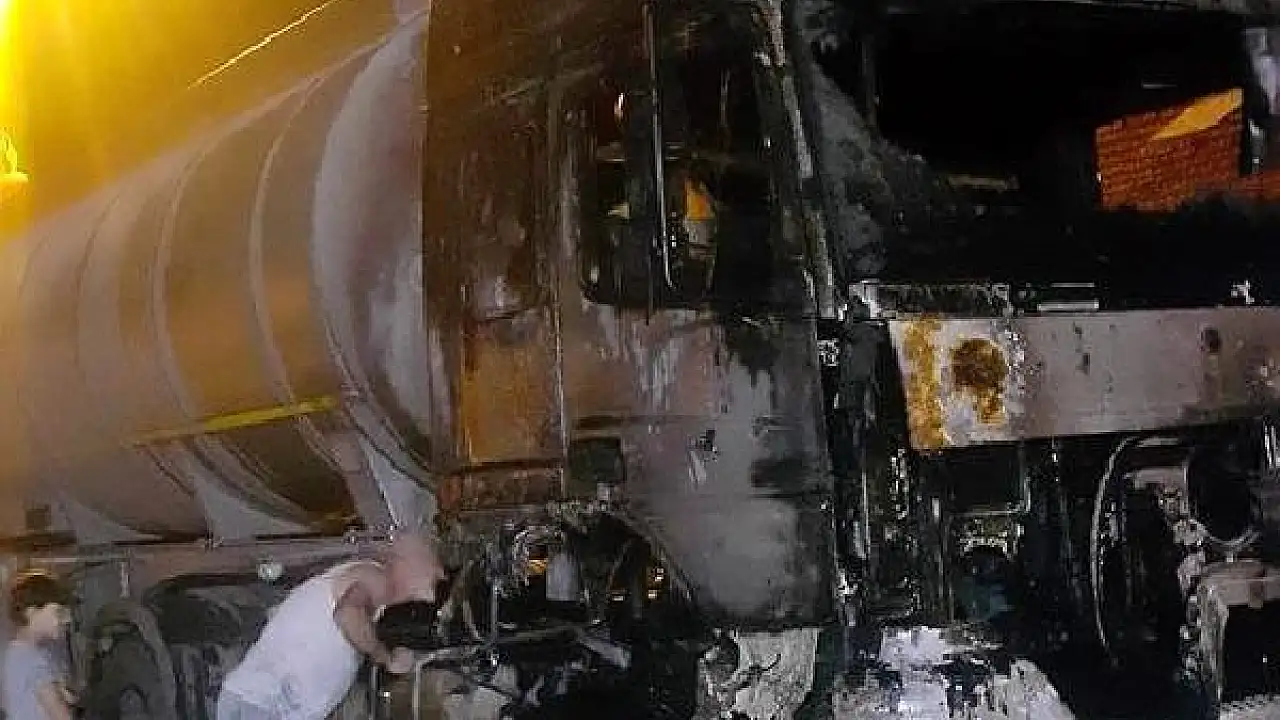 KOCAELİ'nin Körfez ilçesinde, park halindeki TIR'ın çekicisi yandı. TIR sürücüsü ile yakınları, geç geldikleri gerekçesiyle bir itfaiye erine saldırdı.