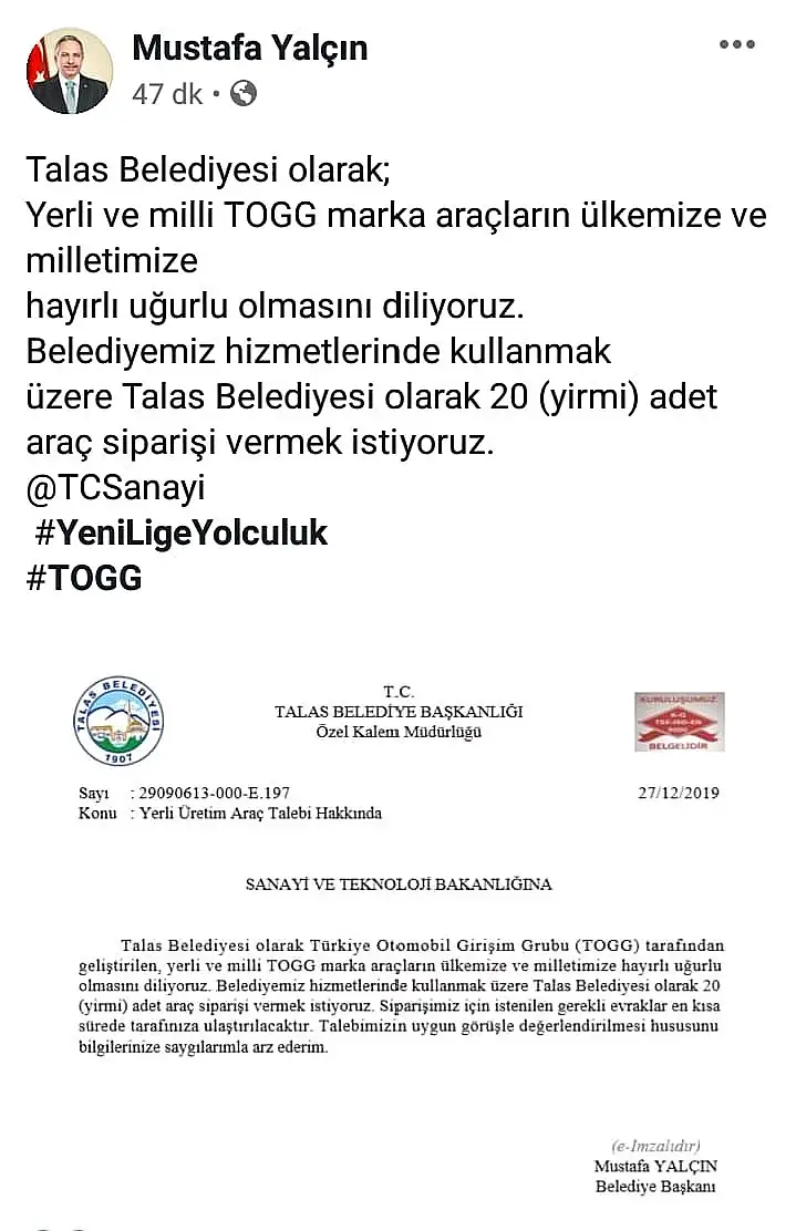 Talas Belediye Başkanı Mustafa Yalçın, sosyal medya hesabından yaptığı açıklamada, "Talas Belediyesi olarak yerli ve milli TOGG marka araçların ülkemize ve milletimize hayırlı uğurlu olmasını diliyoruz. Belediyemizin hizmetlerinde kullanmak üzere 20 adet araç sipariş vermek istiyoruz" dedi.