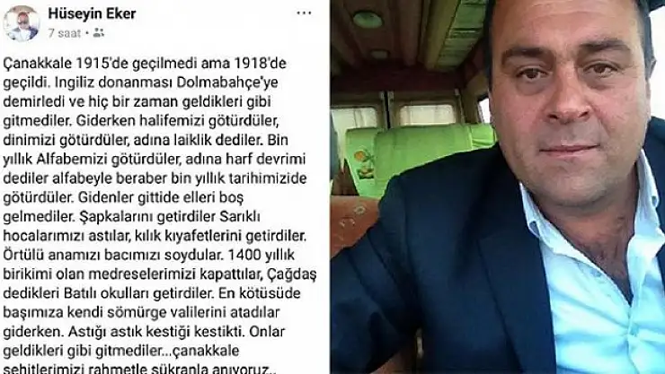 KAYSERİ'nin Tomarza ilçesinde Ak Partili Belediye Meclis üyesi Hüseyin Eker, sosyal medyada 18 Mart Şehitleri Anma Günü nedeniyle yaptığı paylaşımda, Çanakkale'nin 1915'te geçilmediğini ama 1918'de geçildiğini iddia ederek, 'İngiliz donanması Dolmabahçe'ye demirledi ve hiçbir zaman geldikleri gibi gitmediler. Giderken halifemizi götürdüler, dinimizi götürdüler, adına laiklik dediler. Bin yıllık alfabemizi götürdüler, adına harf devrimi dediler alfabeyle beraber bin yıllık tarihimizi de götürdüler' dedi. Paylaşım, CHP ve İyi Parti ilçe yöneticileri ile vatandaşlardan tepki görürken, daha sonra açıklama yapan Eker, yazdıklarından dolayı pişmanlık duyduğunu söyledi.