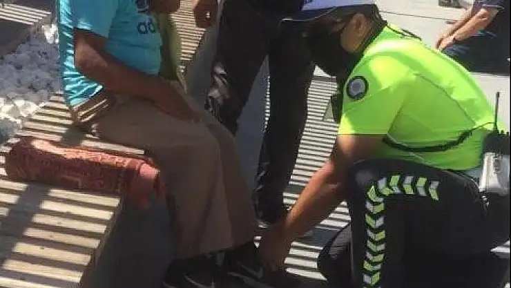 Kayseri 'de bir trafik polisi, Cuma namazı çıkışında engelli bir vatandaşın ayakkabısını giymesine yardımcı oldu ve bağcıklarını bağladı.Tarihi Kayseri Kalesi içinde bulunan Fatih Sultan Mehmet Camii'nde Cuma namazını kılan engelli vatandaşa trafik polisi