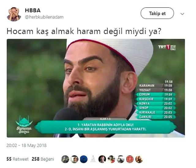 TRT 1 ekranlarında yayınlanan Ramazan Sevinci programında Kur'an-ı Kerim okuyan Mustafa Özyılmaz'ın kaşları sosyal medyada olay oldu.
